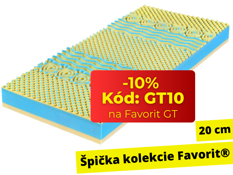 20 cm vysoký ortopedický sendvičový matrac Favorit GT vysokej tuhosti, navyše s pamäťovou penou, s masážnymi anatomickými zónami na jednej strane a tuhou studenou penou na druhej ložnej ploche. Navyše luxusný prateľný poťah.